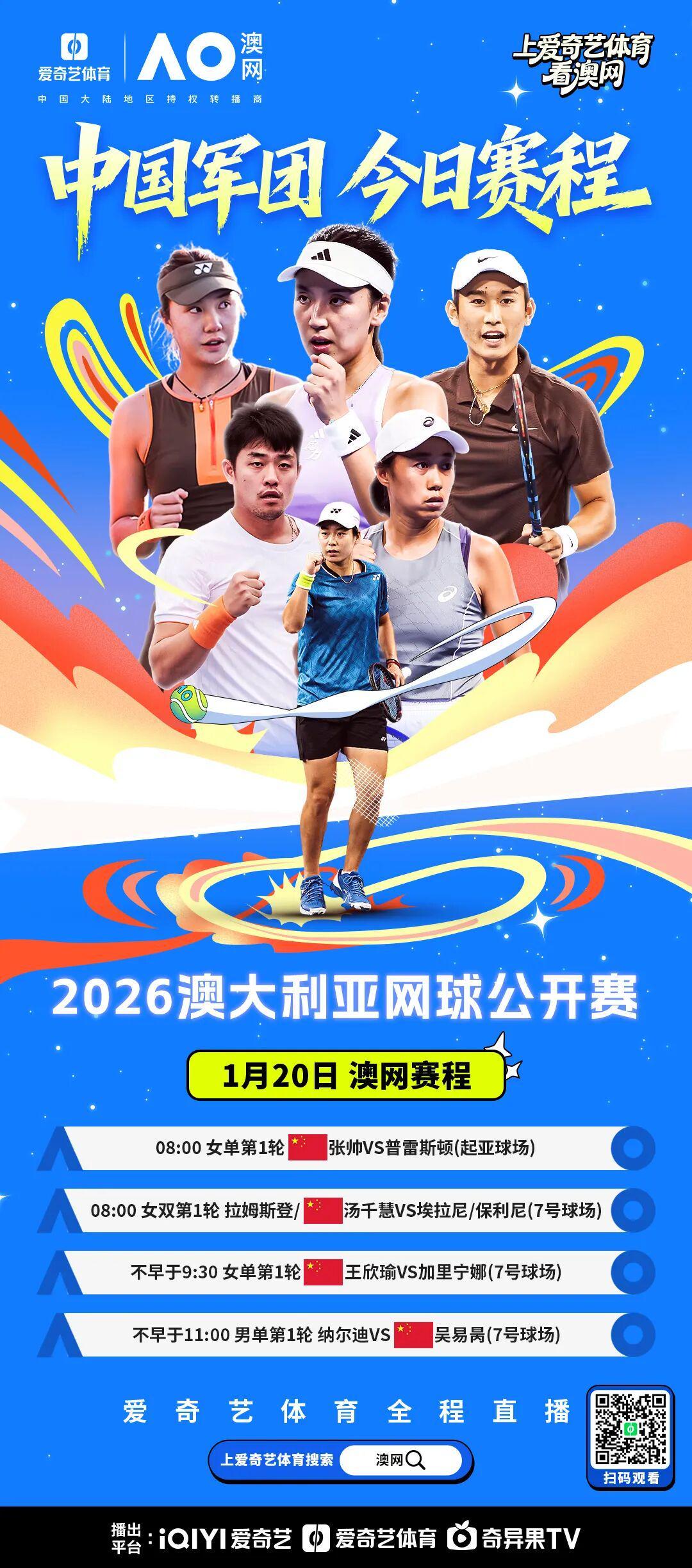 北京时间1月20日,2026澳大利亚网球公开赛第3日比赛将在墨尔本公园全面打响。爱奇艺体育将继续为您全程直播所有精彩对决。
