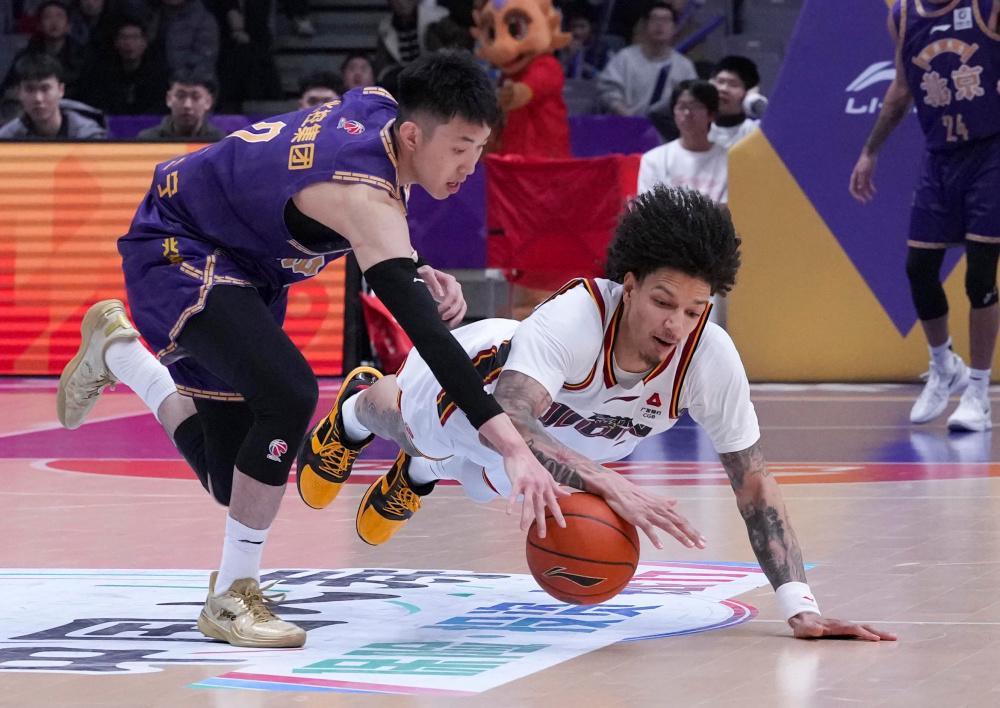 1月26日,北京控股队球员廖三宁(左)和长白山恩都里队球员威尔逊在比赛中拼抢。新华社记者 雒圆 摄